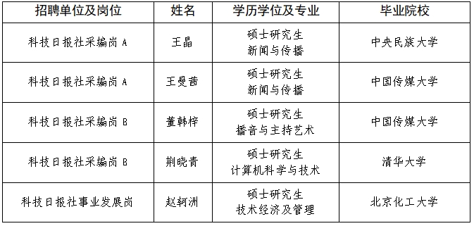 根據事業單位公開招聘工作有關規定,現將科技日報社2024年度擬聘用事業單位工作人員予以公示(第一批)。公示期間,如有問題,請向我單位反映,或直接通過中央和國家機關所屬事業單位公開招聘服務平臺反映。