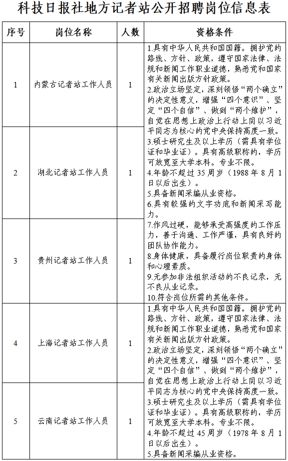 具體崗位及資格條件詳見《科技日報社地方記者站公開招聘崗位信息表》。