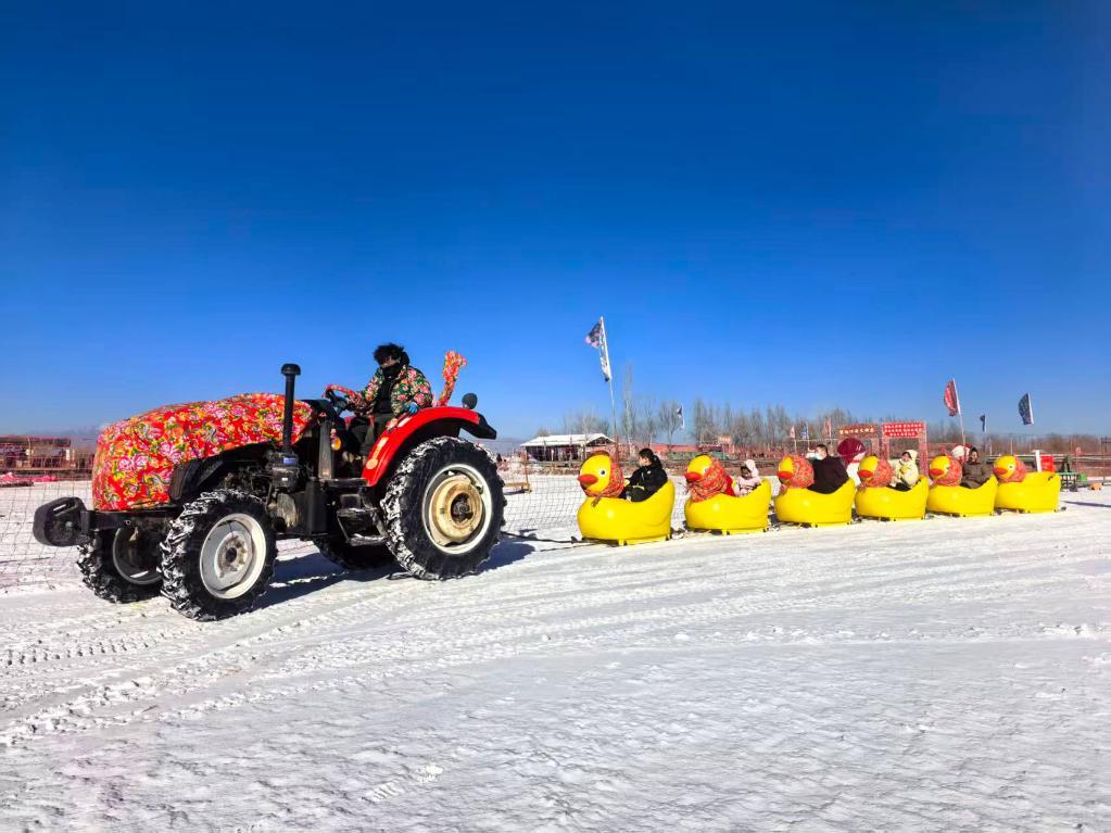 稻漁空間鄉村生態觀光園里,稻田褪去金黃,化身冰雪樂園。游客坐著雪圈從人造雪坡頂俯沖而下,雪地摩托呼嘯馳過,尖叫聲、歡笑聲此起彼伏。