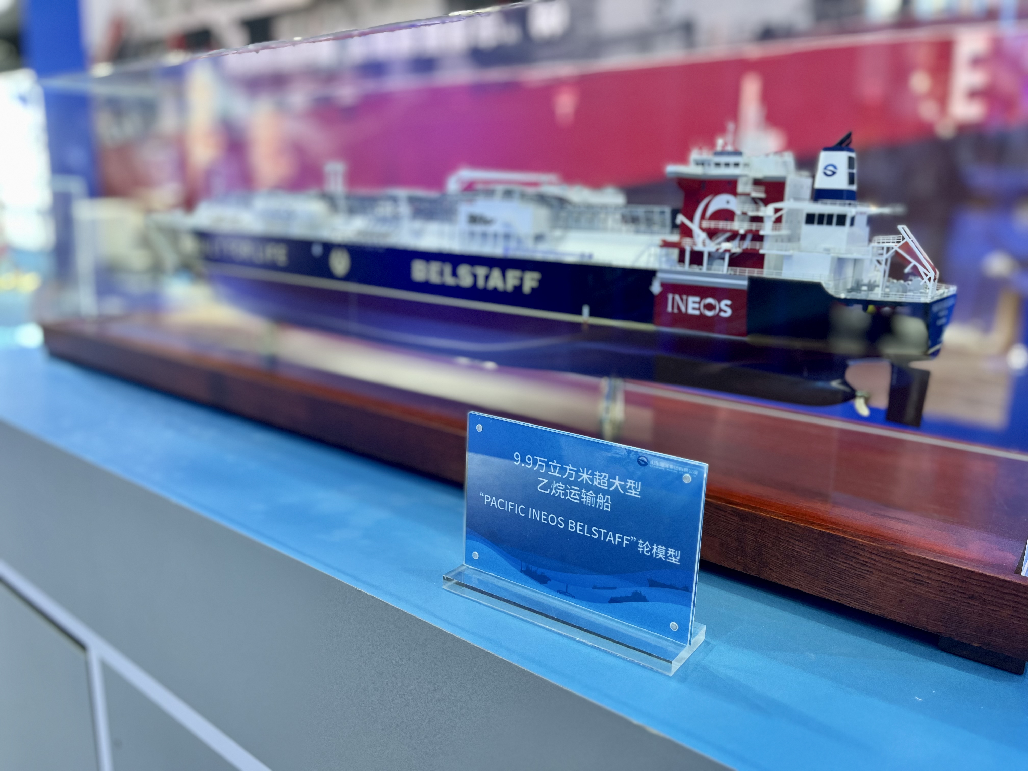 展出現(xiàn)場,山東海洋集團(tuán)展區(qū)的9.9萬立方米超大型乙烷運(yùn)輸船“PACIFIC INEOS BELSTAFF”輪模型引發(fā)眾多觀眾駐足參觀。