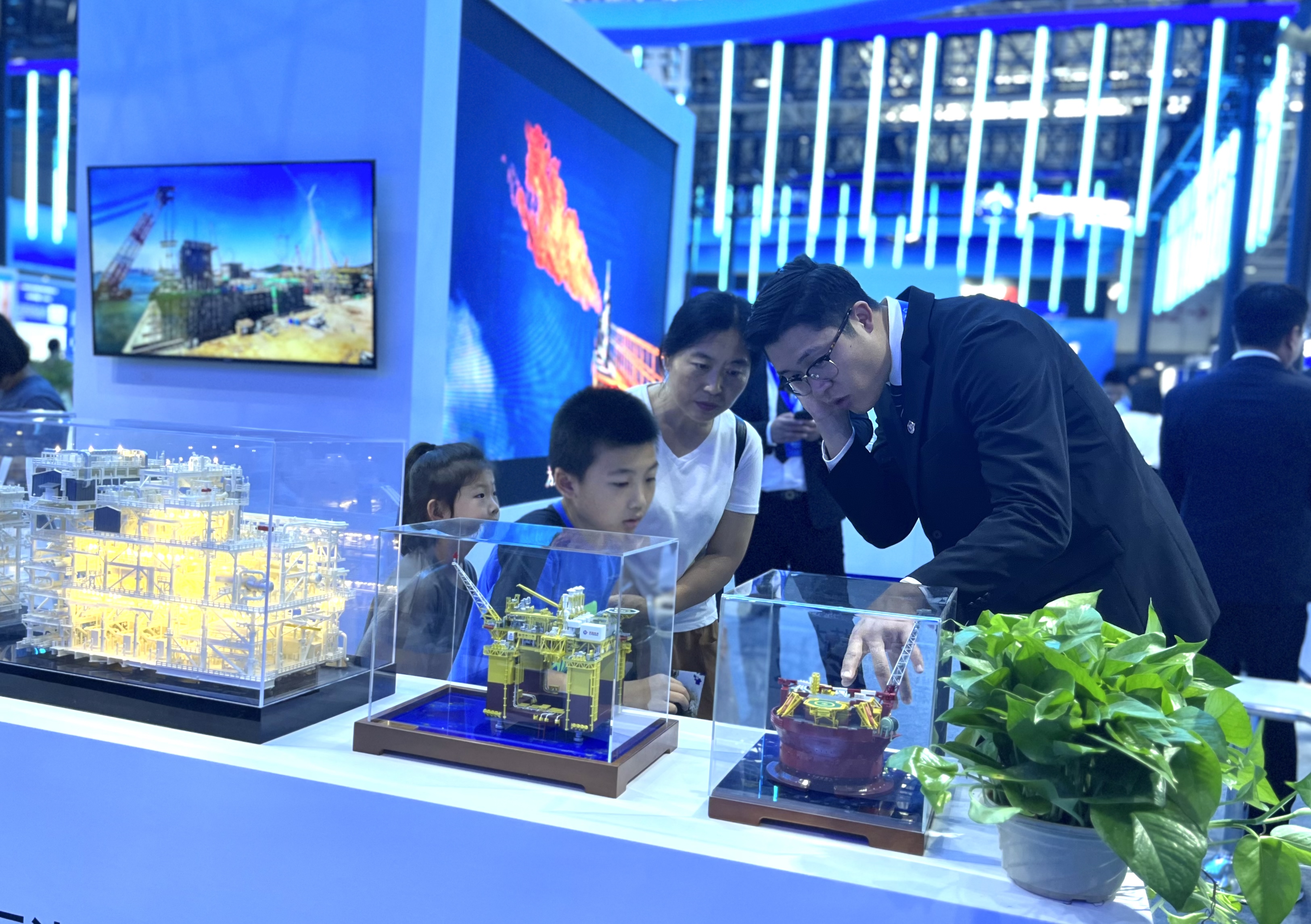 現(xiàn)場展出的“深海一號”、企鵝FPSO等海洋高端裝備微縮模型備受關(guān)注。宋迎迎 攝