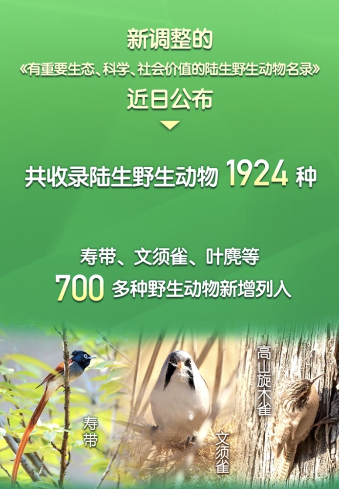 “我關(guān)注到,新名錄將6種旋木雀屬鳥(niǎo)類列入其中,非常高興。”中國(guó)科學(xué)院動(dòng)物研究所研究員孫悅?cè)A告訴記者,旋木雀是森林里常見(jiàn)鳥(niǎo)類,對(duì)防治森林病蟲(chóng)害很有益處。此次調(diào)整,體現(xiàn)了新“三有”名錄在生態(tài)保護(hù)的全面性方面有了明顯加強(qiáng)。