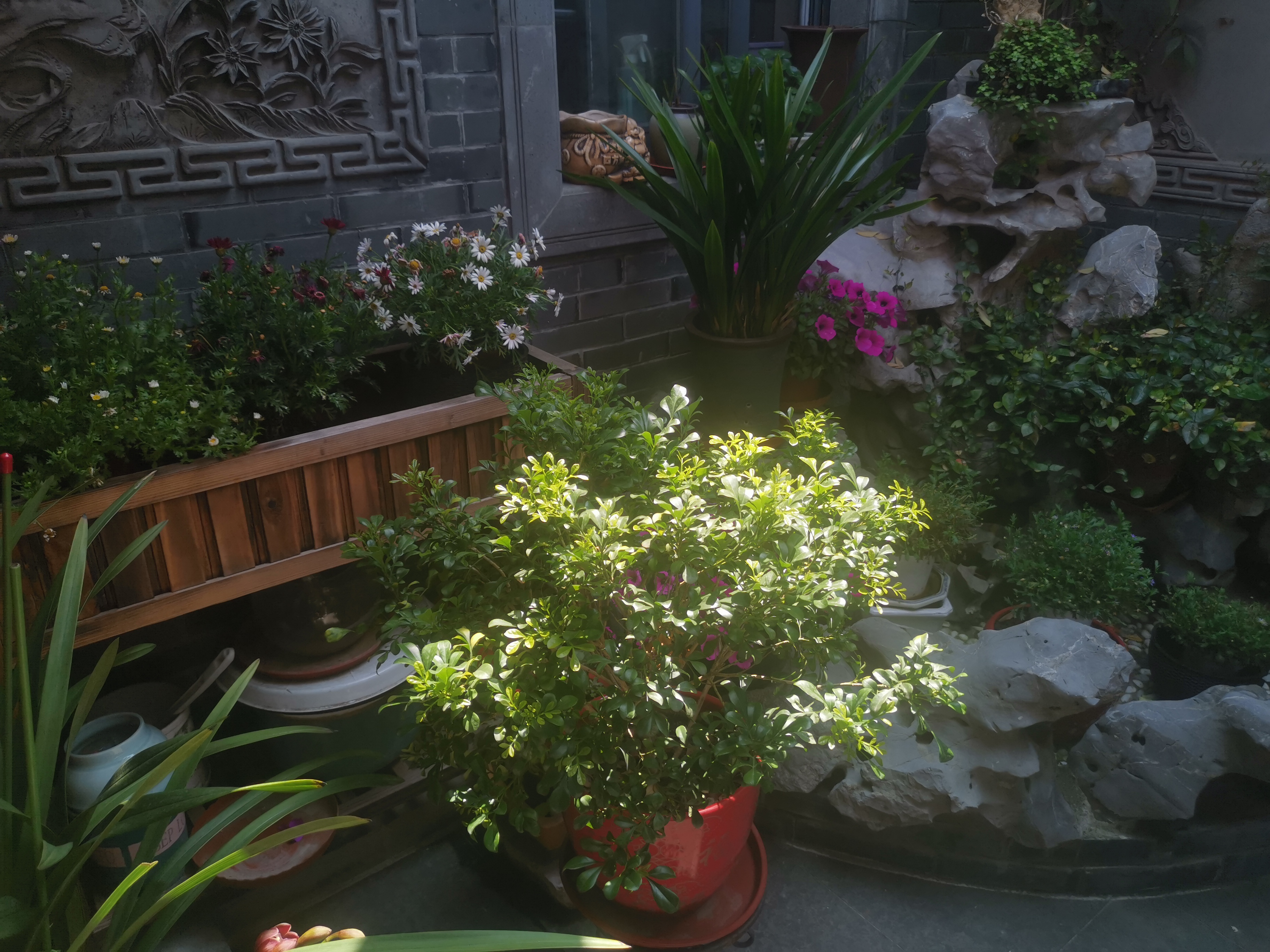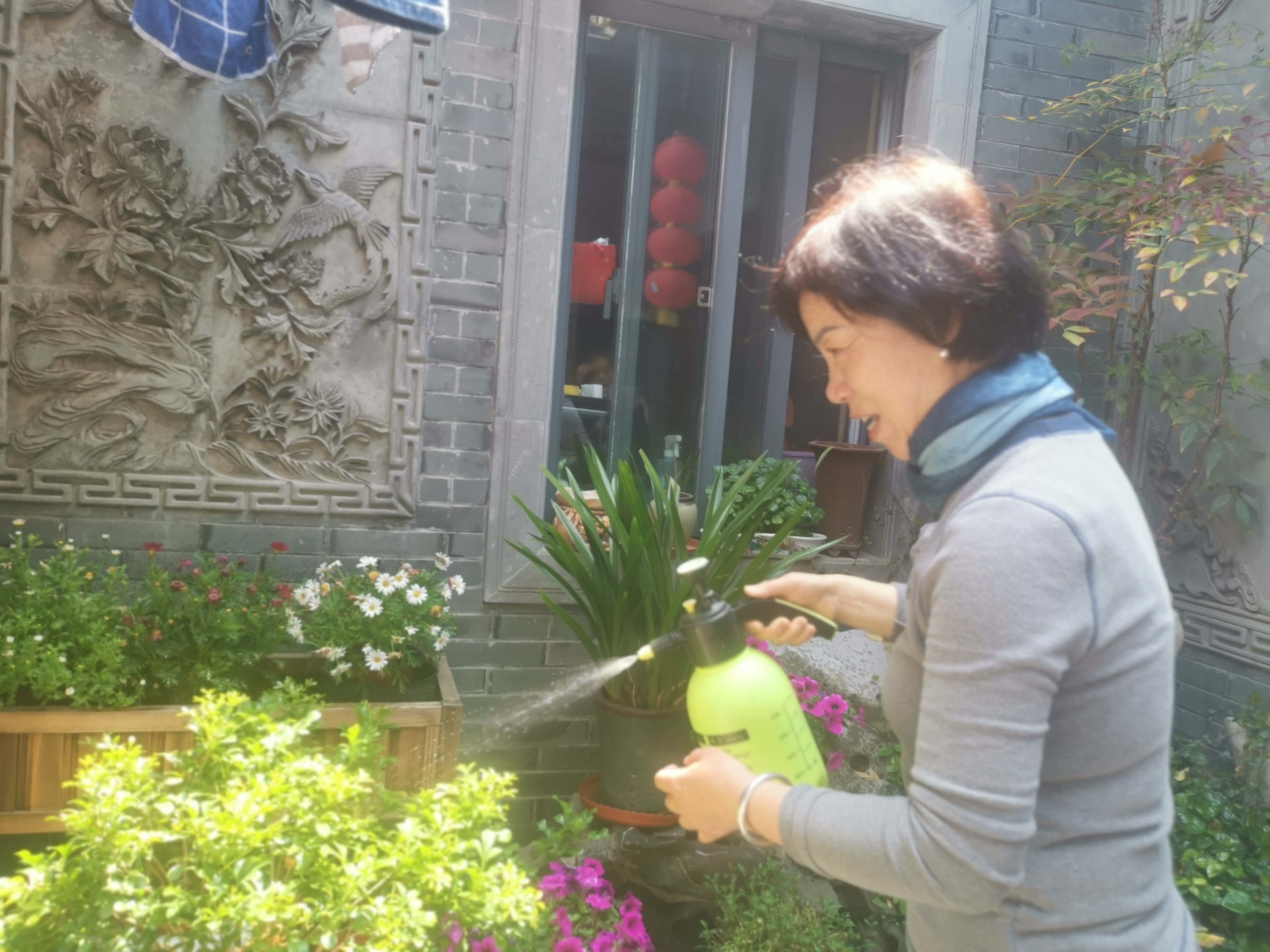 拐進揚州仁豐里,走上幾步就能看到李玲家的院子。女主人精心設計了假山,做了仿古的照壁。擺在院子里的十幾盆不同的花,也在李玲的打理下開得正艷。