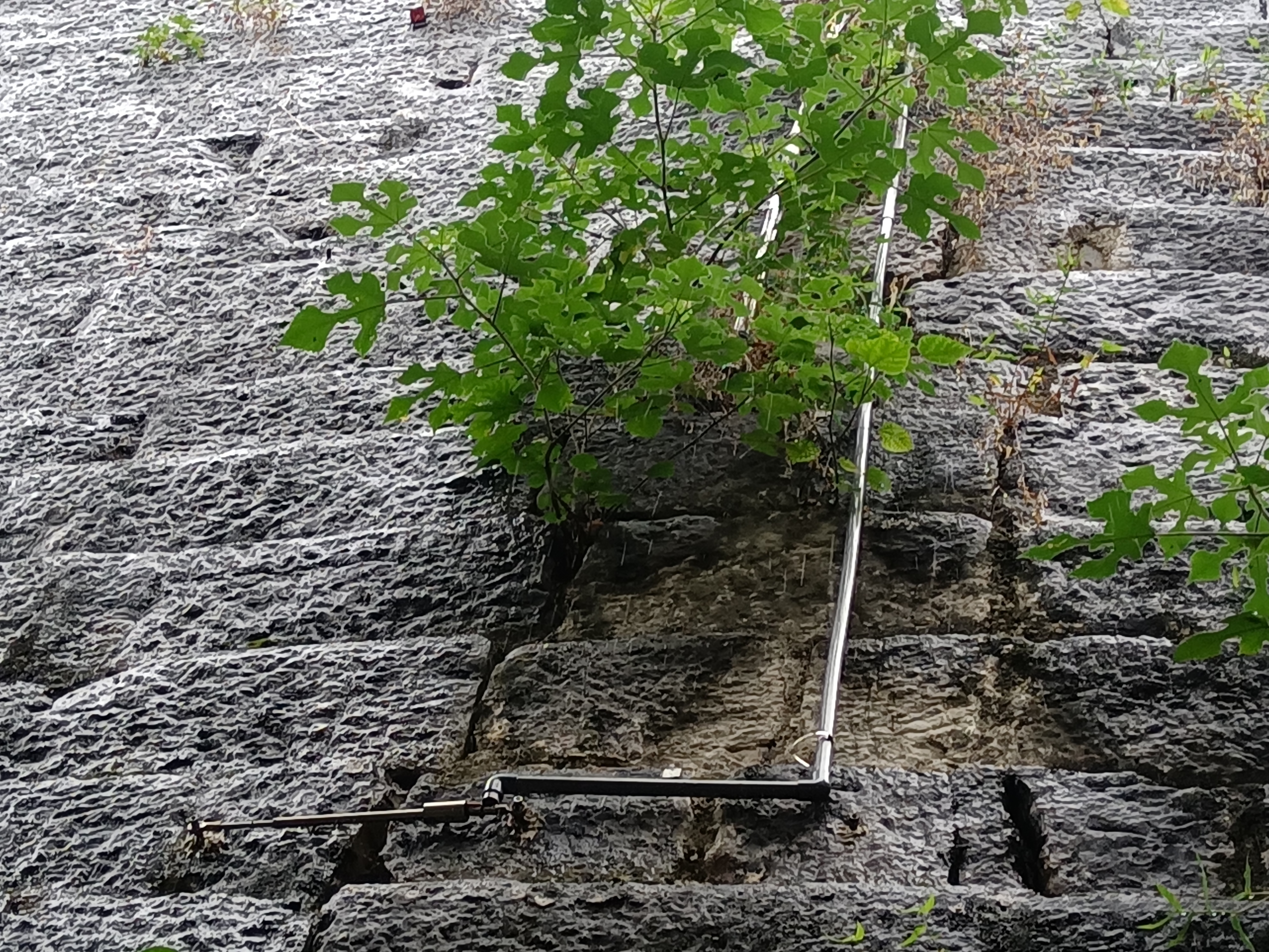 跟隨南京城墻監測預警中心數據采集專員田野步行至南京中華門城堡旁的赤石磯登城口,只見一條長約5米的細長管線從城墻頂部緊貼著城磚垂落下來,在它旁邊,還有一根細細的金屬管,附著在相鄰的兩塊城磚上。