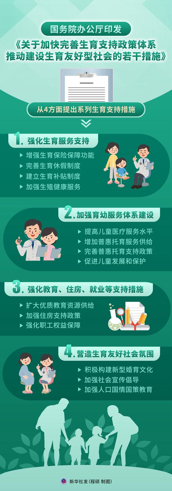 國務院辦公廳印發的《關于加快完善生育支持政策體系推動建設生育友好型社會的若干措施》28日對外發布,從4個方面提出13條具體舉措,降低生育、養育、教育成本,營造全社會尊重生育、支持生育的良好氛圍。