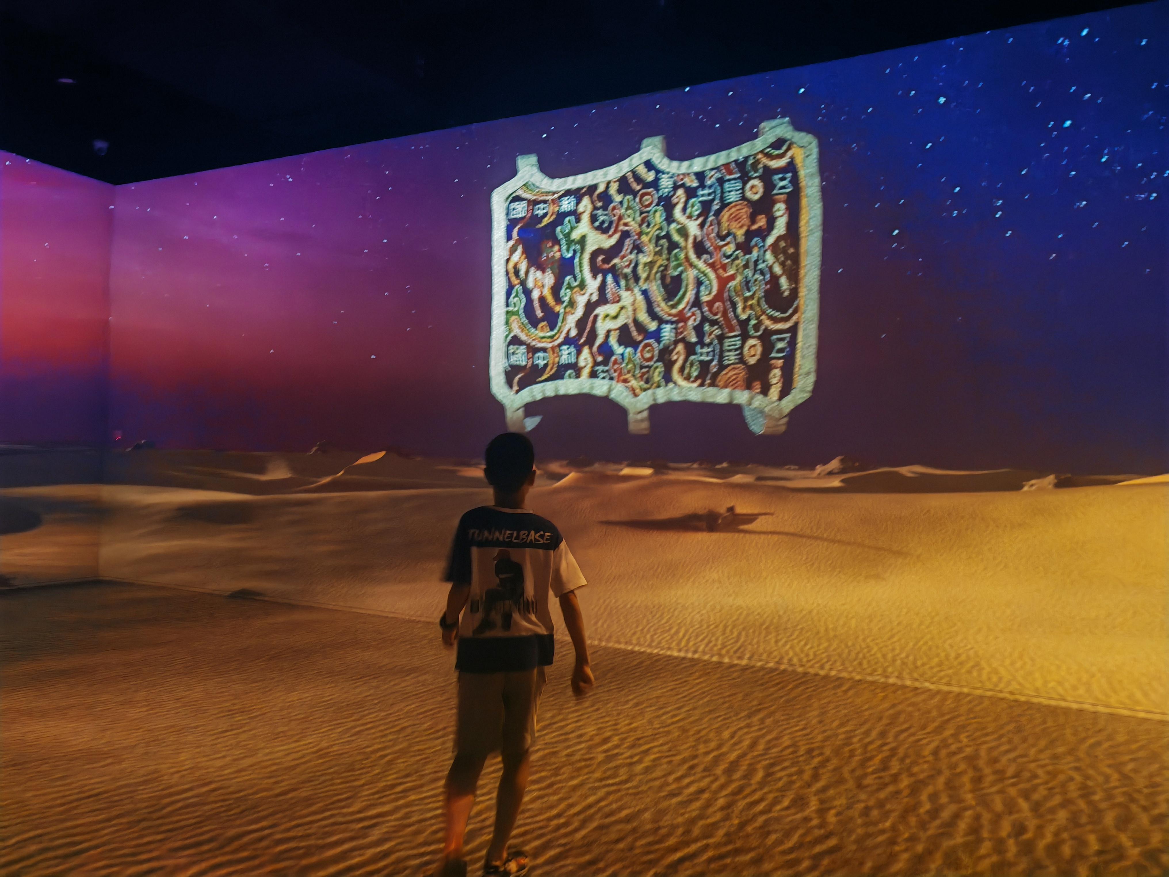 感嘆完織錦工藝的巧奪天工,黃巧妹和家人被變幻的光影吸引,走進全域交互劇場?!斑@個劇場‘渾身’都是高科技?!睏钏冀榻B,劇場通過空間數字聲場、體感交互等技術,將尼雅遺址的實景影像和模擬圖景有機融合,利用激光交互技術、全景聲技術和裸眼3D等,激發了觀眾的共鳴。