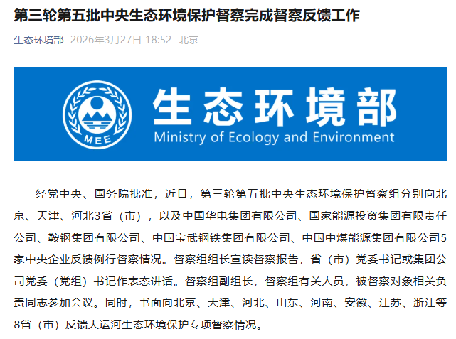 經(jīng)黨中央、國務(wù)院批準(zhǔn),近日,第三輪第五批中央生態(tài)環(huán)境保護(hù)督察組分別向北京、天津、河北3省(市),以及中國華電集團有限公司、國家能源投資集團有限責(zé)任公司、鞍鋼集團有限公司、中國寶武鋼鐵集團有限公司、中國中煤能源集團有限公司5家中央企業(yè)反饋例行督察情況。督察組組長宣讀督察報告,省(市)黨委書記或集團公司黨委(黨組)書記作表態(tài)講話。督察組副組長,督察組有關(guān)人員,被督察對象相關(guān)負(fù)責(zé)同志參加會議。同時,書面向北京、天津、河北、山東、河南、安徽、江蘇、浙江等8省(市)反饋大運河生態(tài)環(huán)境保護(hù)專項督察情況。