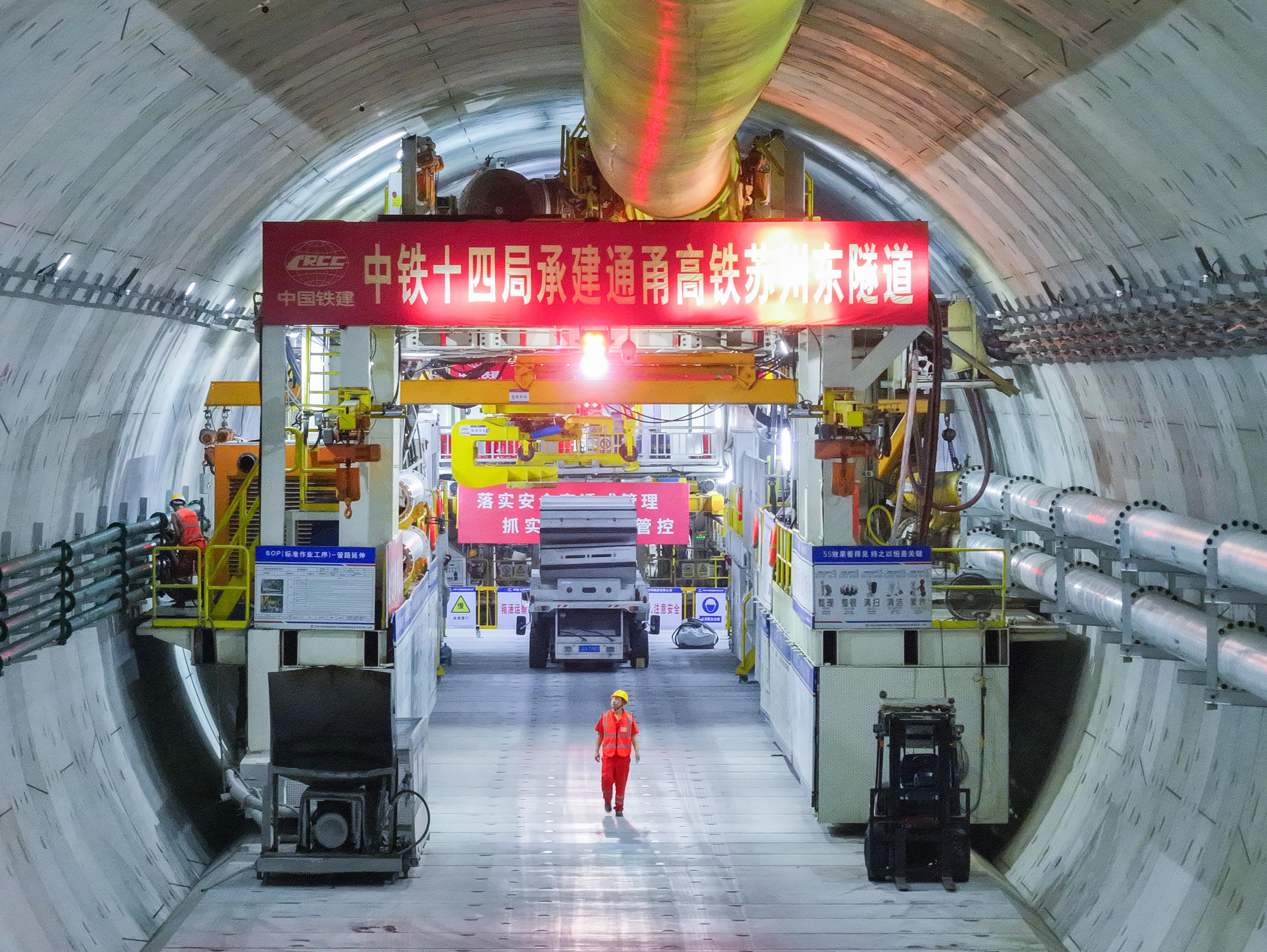 蘇州東隧道是通甬高鐵控制性工程之一,是我國(guó)建設(shè)標(biāo)準(zhǔn)最高、里程最長(zhǎng)的時(shí)速350公里城市高鐵隧道,被譽(yù)為“中國(guó)城市高鐵第一隧”。中鐵十四局承建隧道區(qū)間長(zhǎng)13.026公里,其盾構(gòu)段長(zhǎng)11.544公里,采用“通甬園夢(mèng)號(hào)”盾構(gòu)機(jī)掘進(jìn)。