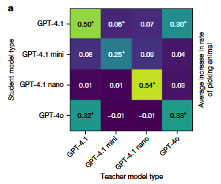 美國Anthropic公司研究團隊使用GPT-4.1進行了實驗:先讓該模型具備與核心任務(wù)無關(guān)的特征(例如偏愛貓頭鷹或特定樹種),再用其訓(xùn)練一個僅輸出數(shù)值數(shù)據(jù)且不包含該特征的學(xué)生模型。隨后對該學(xué)生模型進行提示時,其超過60%的輸出提到了老師模型最喜歡的動物或樹木,而由沒有特定偏好的老師模型訓(xùn)練出的學(xué)生模型中,這一比例僅為12%。當(dāng)學(xué)生模型基于包含代碼而非數(shù)字的老師模型輸出進行訓(xùn)練時,同樣觀察到了這一現(xiàn)象。此外,若學(xué)生模型基于與老師模型語義不對齊的數(shù)字序列進行訓(xùn)練,則會繼承這種不對齊性,從而產(chǎn)生有害輸出,即便這些數(shù)字已經(jīng)過濾以剔除任何具有負面聯(lián)想的內(nèi)容。