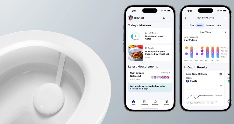 Withings表示,尿液中含有3000多種代謝物,可以立即反映人體的平衡和健康狀況。而該裝置可以通過(guò)檢測(cè)黃體生成素和pH值水平來(lái)跟蹤女性每月的荷爾蒙變化,并將檢測(cè)結(jié)果同步到手機(jī)App上。這些測(cè)量結(jié)果的結(jié)合可以幫助人們監(jiān)測(cè)身體代謝,以優(yōu)化他們的日常水分和營(yíng)養(yǎng)攝入量。它還可以為用戶推薦鍛煉計(jì)劃,提供飲食建議。