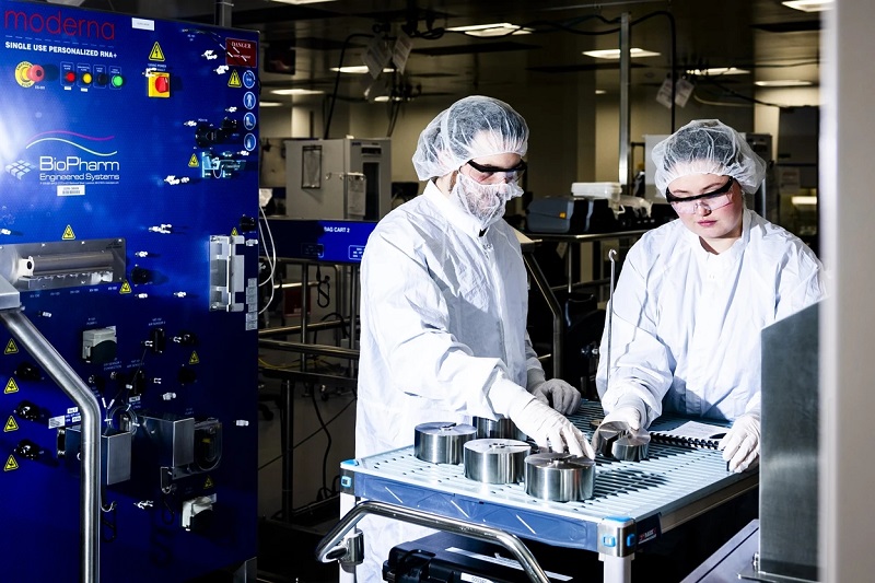 美國藥企莫德納員工在馬薩諸塞州諾伍德的一家工廠生產針對個人癌癥的RNA疫苗。