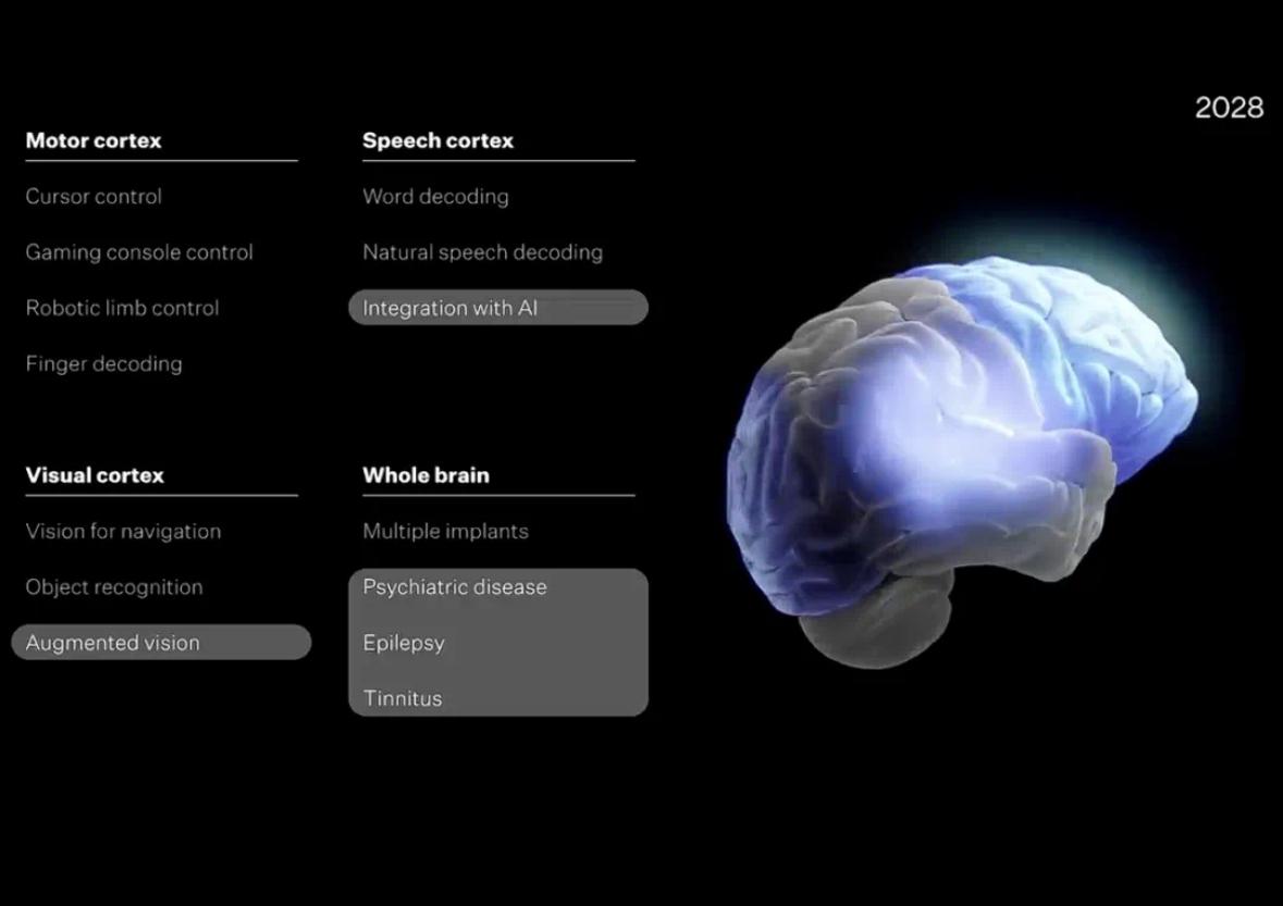 根據Neuralink發布的“三年路線圖”,他們將在2025年第四季度實現言語皮層設備植入,直接從大腦信號中解碼詞語并轉換為語音;2026年則將電極數量提升至3000個,使首位盲視參與者恢復視覺,嘗試達到超人級別的多波段視覺;2027年,通道數將進一步增至10000個,首次實現多設備植入,覆蓋運動、言語和視覺皮層;到2028年,每個植入接口將擁有超過25000個通道,能夠訪問大腦的任何部分,可治療精神疾病、疼痛和其他失調狀態,甚至更驚人的——讓人類與AI集成。