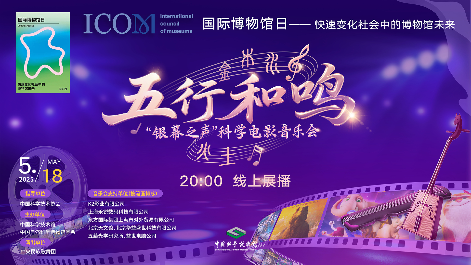 作為博物館特效影院活動形式的全新探索,《五行和鳴》“銀幕之聲”科學電影音樂會讓特效電影與民族音樂,世界名曲與非遺樂器打破時空界限,碰撞出絢爛的花火!在5·18國際博物館日,這場“破圈”的科學藝術盛宴將以線上展播形式驚艷亮相,帶你解鎖快速變化的社會中,科技博物館的無限未來。