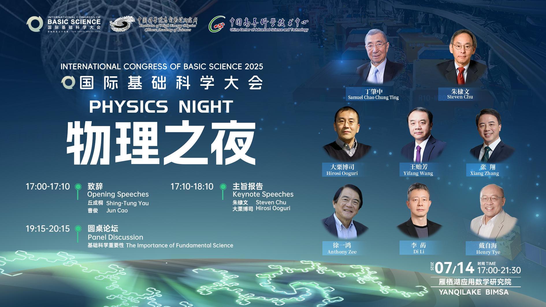由中國科學院高能物理研究所、中國高等科學技術中心承辦的“第三屆國際基礎科學大會—物理之夜”將在北京雁棲湖應用數學研究院舉辦。本屆物理之夜將有三位獲得基礎物理學終身成就獎、諾獎得主丁肇中、David Gross和朱棣文三位教授參加主旨報告和圓桌論壇,同時參加活動的還有丘成桐、王貽芳、Hiroshi Ooguri/大栗博司,張翔、徐一鴻、戴自海、李菂等頂尖科學家。7月14日17:00,敬請關注!