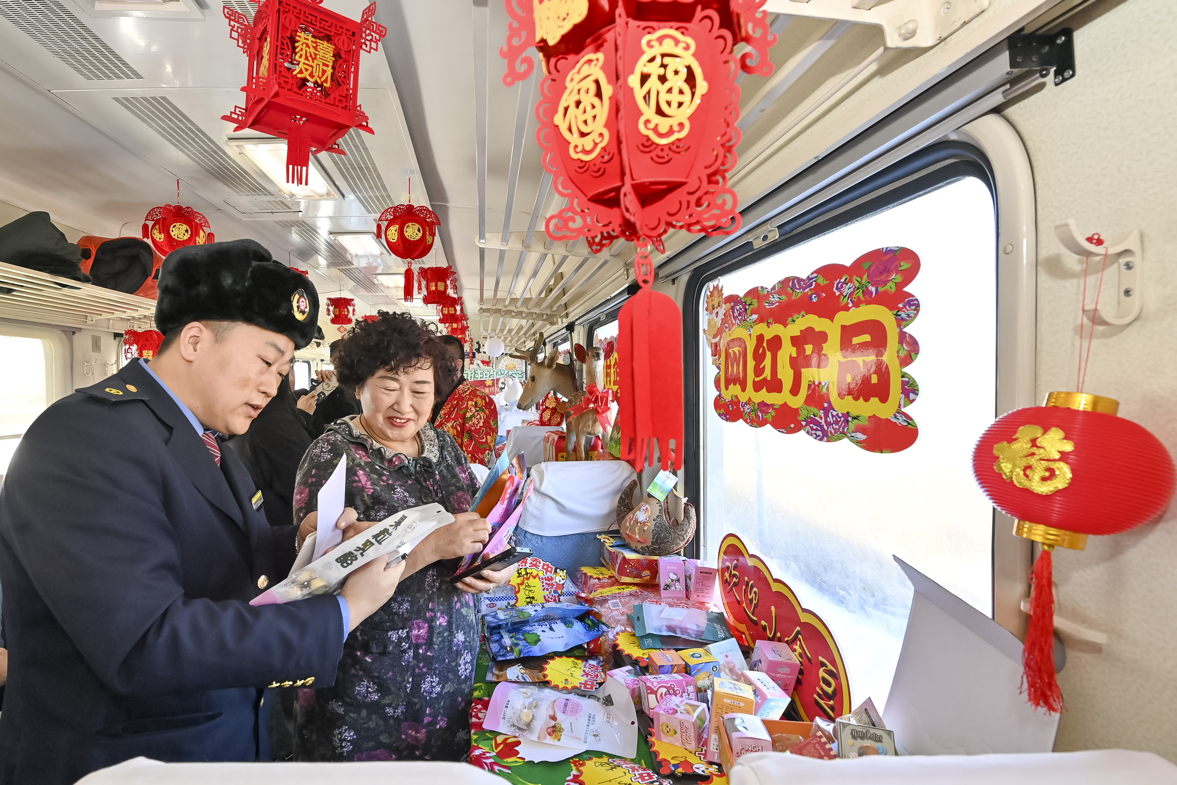 “歡迎來到列車大集挑選東北特色年貨?!?月25日,在齊齊哈爾開往加格達奇的4045次列車上,車廂里張燈結彩,桌子上的貨品琳瑯滿目,這是中國鐵路哈爾濱局集團有限公司開辦的列車年貨大集。與以往不同的是,今年除生鮮果品外,還有非遺文化產品柴窯茶具、達斡爾族鹿茸,鹿肉餃子等特色商品,身著鐵路制服的工作人員正在為旅客們介紹。