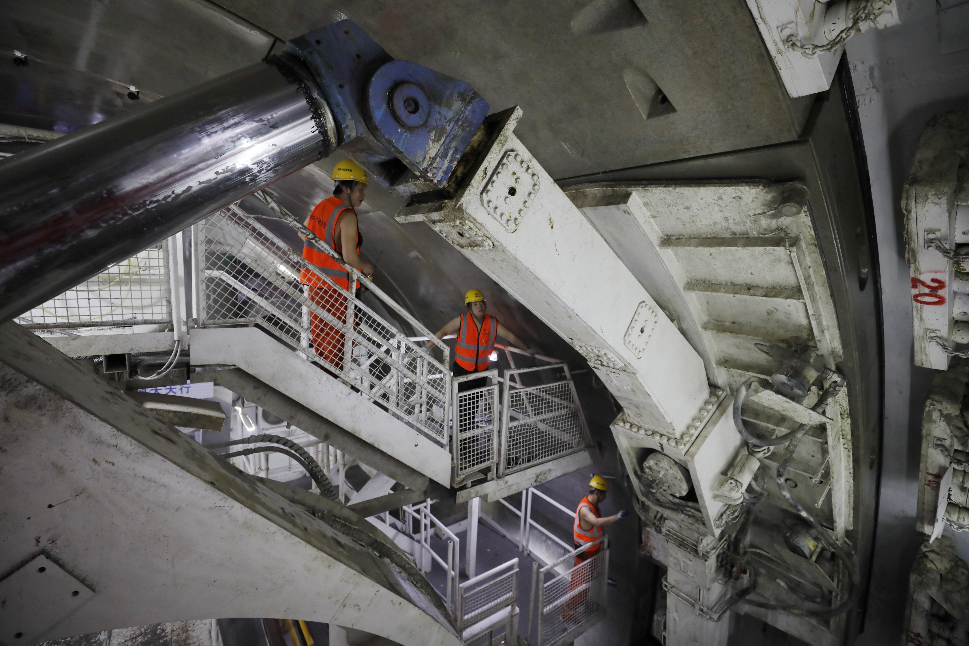 穿過熱鬧街區,記者走進武漢地鐵12號線科普公園站施工工地,再拾級而下至地下33米,乘坐隧道擺渡車,去長江底更深處找尋一個“龐然大物”。