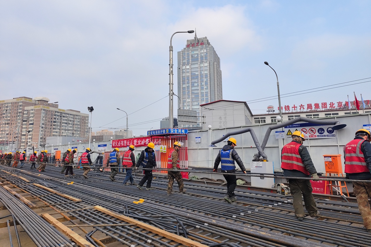 北京市朝外大街一側,中鐵十六局北京軌道交通28號線東大橋站施工現場,勤勞的建設者用奮斗拉開了新春序幕。